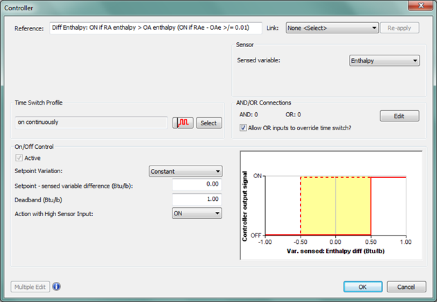 In the case illustrated in Figure 6-23 and the first of the two example control dialogs in Figure 6-24 , the controller senses the difference between temperatures in the return and fresh air inlet ducts and returns an ON signal if the return air enthalpy is greater than the outside air enthalpy. This signal is fed, via an AND connection, into the damper set controlling outside air intake.