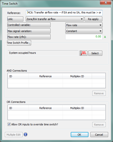 Second, the time switch profile has a special function in airflow control. Rather than being interpreted as ON (as denoted by a value greater than 50%) or OFF (other values), the profile is treated as a modulating function multiplying the numerical control signal. This feature can prove useful as a means of setting time-varying flow rates.