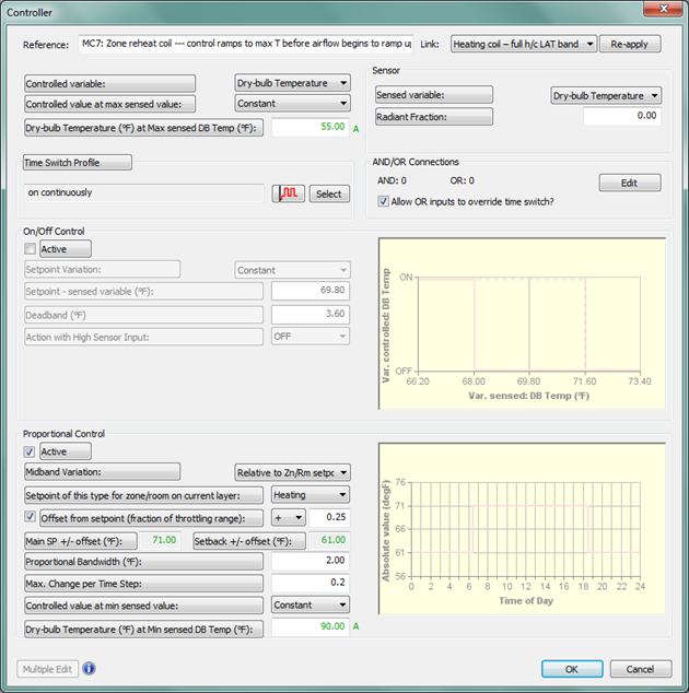 This is the simplest type of controller. It controls a variable at a constant value at prescribed times (subject to physical feasibility and the optional addition of AND connections). When it is attached immediately downstream of a component such as a heating coil it controls the coil in such a way as to set the off-coil temperature, provided this is feasible given the on-coil condition, the airflow rate and the coil’s capacity.