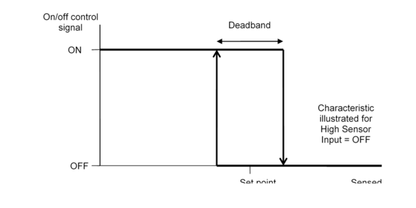 The state of the on/off controller switches between ON and OFF as the sensed variable rises through the upper limit or falls through the lower limit of the deadband. Within the deadband the signal retains its current value. The characteristic gives rise to hysteresis: the value of the control signal in the deadband depends on the history of the sensed variable as well as its current value.