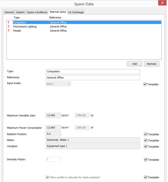 This tab is displayed for all building spaces (rooms, voids and plenums). It specifies internal gains to the space (sometimes called casual gains).
