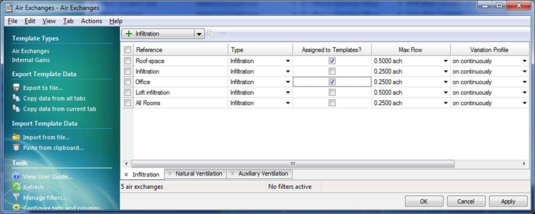 Editing air exchanges works in a very similar way to editing air internal gains. To edit air exchanges for templates, mark all the templates that you would like to edit then click Edit Air Exchanges from the toolbar. You will see a dialog similar to the one below: