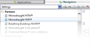 To get started, click on the dropdown list of available Navigators at the top of the Navigators pane (if the pane is not visible on the left side of the VE window, you can turn it on using the button on the application toolbar, or by selecting Navigator from the view menu). You will find a Monodraught HVR® entry listed under the Partners section.