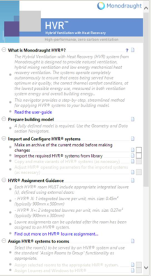 When selected, the Monodraught HVR® navigator will be displayed. This is what you will use to go through the process of applying HVR to your building, simulating and analysing the results.