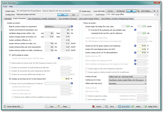 The System Parameters user interface replaces all functions of the Loads Data spreadsheets, and significantly improved upon what was possible with the spreadsheets. Many settings previously assumed in the Loads Data spreadsheet formulae are now explicit and readily selectable checkbox options in the dialog. New options, such as airflow autosizing based on zone latent loads as well as sensible loads, are also offered. Ventilation calculations and related user inputs significantly expand upon previous offerings with respect to Demand Controlled Ventilation (DCV), ASHRAE standard 62.1 Appendix A ventilation calculations, ASHRAE standard 170 for Healthcare, and options for partial transfer vs. 100% transfer air or 100% primary air as makeup for exhaust, as needing in laboratories and similar spaces with complex ventilation and exhaust requirements. There is also enhanced autosizing for systems combining standard VAV zones with zones served by parallel fan-powered boxes, and for DOAS systems using fan-coil units and active beams.