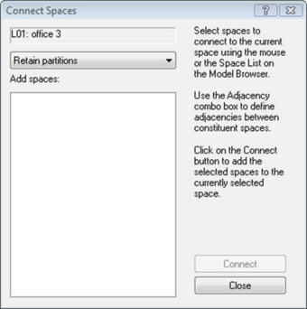 Before you connect the spaces you can decide if you wish the partitions between them to be removed or retained after connection, by selecting the required option from the drop down list in the Connect Spaces dialogue box. To connect the two spaces (i.e. to create a single composite space) click the "Add" button.