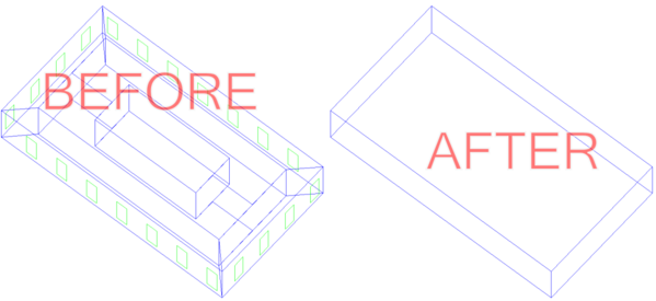 Looks at the selected space, and detects surfaces which lie in the same plane, but face in opposite directions (are mirrors of each other). It clips them in relation to other polygons, and then deletes any remaining pairs of mirrored faces facing in opposing directions.