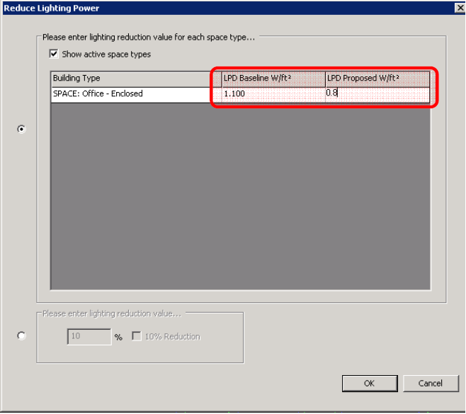 Set proposed lighting power densities by specifying a reduction over the default baseline value
