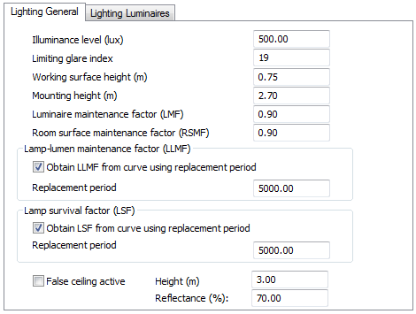 This category is used to assess the depreciation in light output from the lamp over a given time. This has a two-fold functionality. Either the LLMF can be obtained from the curve using the replacement period which can be defined or by entering the LLMF itself as a value no greater than 1 by unticking the box in this section.