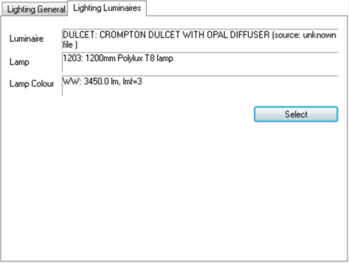 This contains controls for setting luminaire, lamp and lamp colour combinations. The Select button opens the Light Fitting dialogue box. You can only select data which is held in the system database or has from a custom database which has had its path already defined within the lighting program which will be used. See the Lighting user guides for more information.