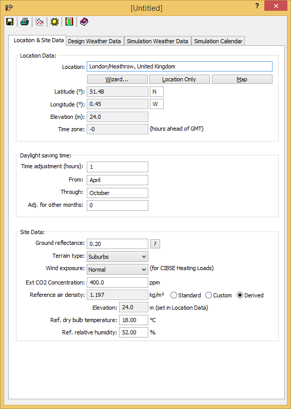 The Selection Wizard… button launches a series of dialogs which help the user select the location, the design weather data and the simulation weather data. The Set Location Only button allows the location alone to be set without using the wizard.