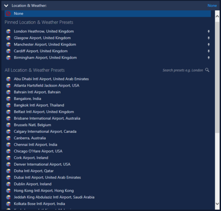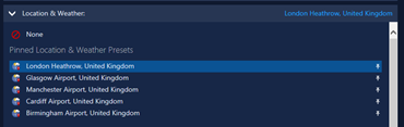 You can also choose to “pin” commonly-used presets – this means they will be displayed at the top of the group, in a separate Pinned Location & Weather Presets list. By default, there will be five pinned presets appropriate to the IES region derived from your PC’s locale settings, but you can choose to un-pin these, or add pin presets.