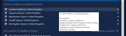 Additional information about a preset will be displayed whenever the mouse pointer hovers over it after a short delay – this allows you to see the location, weather file name, design weather details and holiday template information (if any) for the preset: