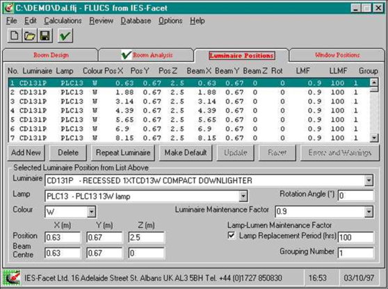 Details for each luminaire position should be entered on a separate line. Regular arrays can be created using the Repeat Luminaire option.