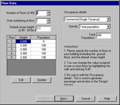 Press this button to edit one or more cells selected in the Floor/Height/Population grid while entering data for each floor in the building. The following dialogue boxes will be displayed: