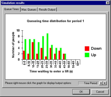 This dialogue box displays the distribution of queuing times encountered by passengers in each period of a simulation. The time that each passenger had to wait before entering a lift is displayed on the axis, in classification bands of 5 seconds. The number of people whose waiting times lie within each range are given on the y axis. The Up and down legends state which bars correspond to queues of people waiting to travel either upwards or downwards in a lift.