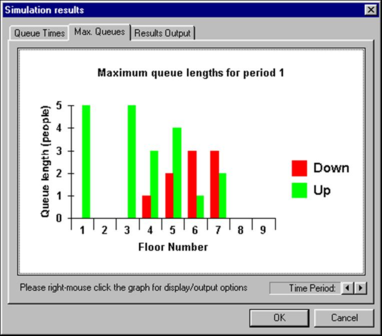 This dialogue box displays the maximum queue lengths on each floor for each period of a simulation. The Up and down legends state which bars correspond to queues of people waiting to travel either upwards or downwards in a lift.