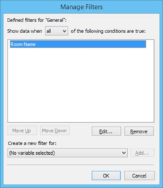 One of the more powerful filtering features in Tabular Space Data is the ability to filter on columns that aren’t actually displayed in the current tab. In order to do this, you use the Manage Filters window – this lists all the filters that are defined for the tab, allowing you to create new filters, edit and/or remove existing filters and control how the overall filtering is applied (i.e. whether a room must pass all defined filters, can pass any filter or must pass none of the filters).