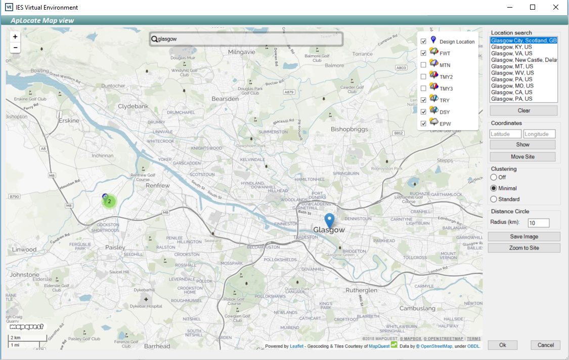 The Map option on ApLocate opens a map (powered by Open Street Map) that allows selection of location, design weather data and simulation weather files by searching for and clicking on any location