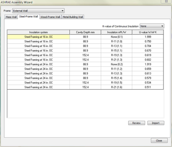 ASHRAE construction wizard…: Displays the ASHRAE Assembly Wizard dialog, where you can create constructions suitable for use in ASHRAE compliance. Some of these may generate constructions with composite layers (see Composite layers). See also ASHRAE 90.1 tables (A3.1a/b etc.).