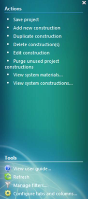 Library (constructions and materials): Displays a sub-menu giving you access to any of the library materials or constructions. For example there is an IMPACT library for use in the cost planning and life cycle software.