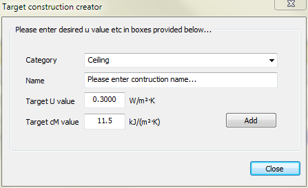 Create target construction…: Displays the Target construction creator dialog, where you can create a construction with a desired category, description, U-value and cM value. . The rules for calculating the cM value (the effective thermal capacity) of a wall floor, ceiling etc. can be found in the CEN standard: prEN 13790.