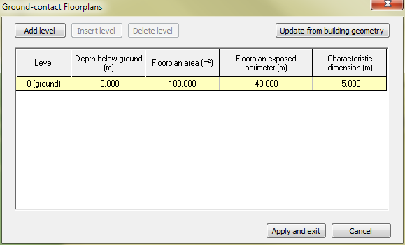 Ground contact floorplans…: Displays the Ground-contact Floorplans dialog. This allows you to manually specify properties of levels of the building which are in contact with the ground, for use (for example) in UK Part L2 where these details are essential for ensuring an adequate U-value for ground-contact walls and floors. The properties may also be assigned automatically from the building geometry. Details of this dialog and related utilities are described in Section 4.