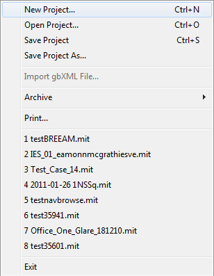 The File menu handles file operations. Note that there are no options for opening FlucsPro project files - this is because the FlucsPro project file always has the same name as the ModelIT file but with a *.flp extension. All you need to do is open the correct ModelIT file, and the FlucsPro project file is opened automatically.