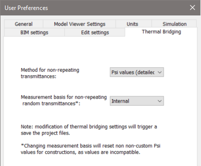 If a model set for the detailed method is revised to the simple coefficient-based method this will delete all random transmittances geometry (the random thermal bridging impacts surfaces in the simulation model, thus they must be deleted in this reversion). It is suggested the model is archived if this is necessary. A warning will displayed in this situation.
