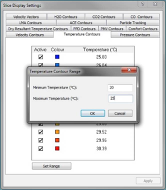 4. To change the scale of the colours, go to Display Settings and select the appropriate tab. On that tab select ‘Set Range’ to change the scale of results. Click apply after you are done. The results will change the way they are displayed. The default scale goes from the lowest to the highest recorded value of that variable.