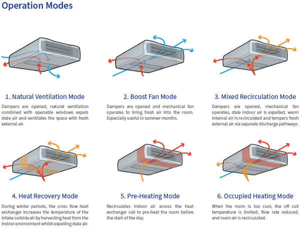 The system comprises of an intelligent and fully automatic control system coupled with a low energy ventilation system which switches between operational modes dependent on season, external/internal temperature conditions and indoor air quality (IAQ). At all times the system will utilise natural ventilation as its primary mode, then as the internal room temperatures or CO2 concentration increases, the low energy internal fan will operate to provide fan assisted natural ventilation at variable speeds dependent on the internal room conditions. System automatically provides secure night time cooling through natural ventilation opening or fan assisted if required. Winter ventilation automatically modulates dampers to mix re-circulated air with external air to ensure optimum ventilation temperatures.