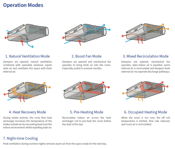 The system comprises of an intelligent and fully automatic control system coupled with a low energy ventilation system which switches between operational modes dependent on season, external/internal temperature conditions and indoor air quality (IAQ). At all times the system will utilise natural ventilation as its primary mode, then as the internal room temperatures or CO2 concentration increases, the low energy internal fan will operate to provide fan assisted natural ventilation at variable speeds dependent on the internal room conditions. System automatically provides secure night time cooling through natural ventilation opening or fan assisted if required. Winter ventilation automatically modulates dampers to mix re-circulated air with external air to ensure optimum ventilation temperatures.
