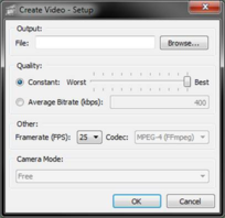 Upon clicking the ‘Record Video’ button in the Movie toolbar the user will be presented with the Setup window (see above). This allows the user to set the output destination and format. The supported formats are as follows: avi, mpg, mp4 and wmv. The user can then select the video’s output quality by using one of two options: Constant Quality (VBR) or Average Bitrate (CBR). After that the user can select the rate at which the video is recorded and played back. Using the default quality and frame rate settings is recommended.