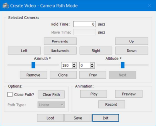 When the user clicks on the ‘Camera path’ button in the Movie toolbar they will be presented with the window above. From there, they can either load a previously designed camera path or create a new one from scratch. Unlike the old camera path feature the new one allows the user to place cameras using a ‘point and click’ method. From there the user can manipulate the camera’s position, orientation, and animation settings while using the ‘preview’ window to view the scene as the camera does. When happy with the camera path the user can preview the animation using a variety of methods and finally, if desired, record a video of the animation. For a list of keyboard and mouse controls on manipulating the camera path click