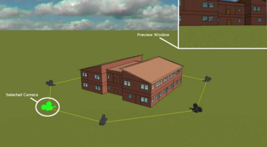 To select a camera the user should Ctrl + Left Click on the desired camera. The camera will be highlighted and the ‘preview’ window will appear in the top right of the view. The ‘preview’ window shows the scene exactly how the camera will at that point. In the camera path dialog the user is able to modify the number of seconds the animation will pause at the current position and how long it will take the camera to move to the next position if applicable. The user can also remove the camera or select the previous/next camera in the path. Using the keyboard/mouse controls the user can also modify the camera’s position/orientation as well as clone/remove the camera.