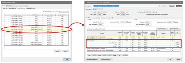 For continuous insulation and frame construction assemblies the NECB 2017 Navigator entries facilitate assembly data entry via the VE’s construction tool or the construction tools composite layer / wizard options.
