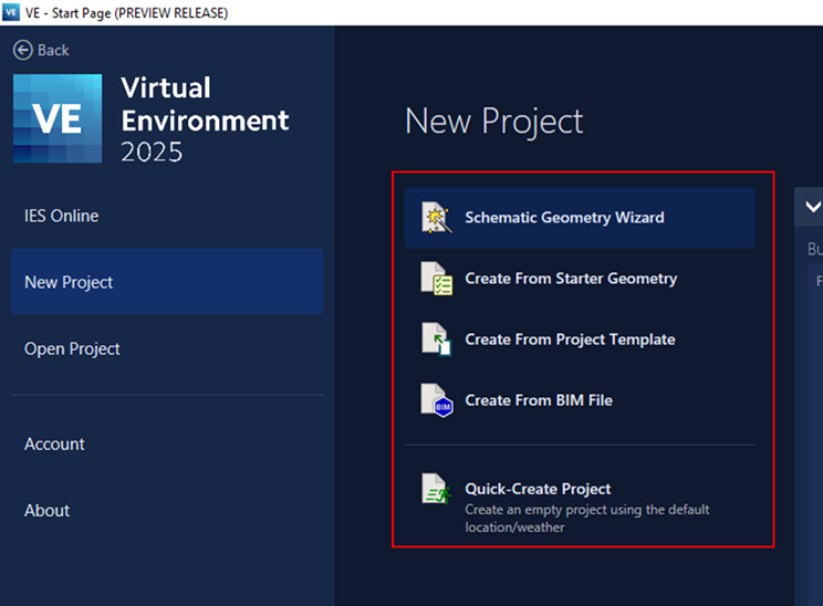 - Create From BIM File: Allows creation of a project including the geometry and/or data from a gbXML, IFC or veXML model, with configurable options for what will be imported.