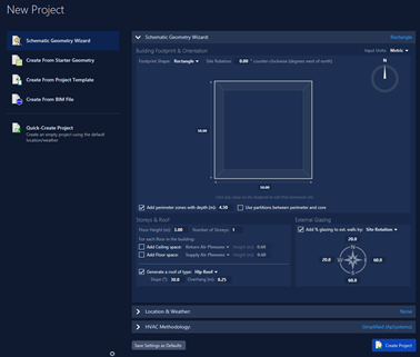 - Create From Starter Geometry: Allows creation of either a blank project (no pre-defined geometry) or with one of 16 common pre-defined building types (e.g. Small Office, Primary School, Secondary School).
