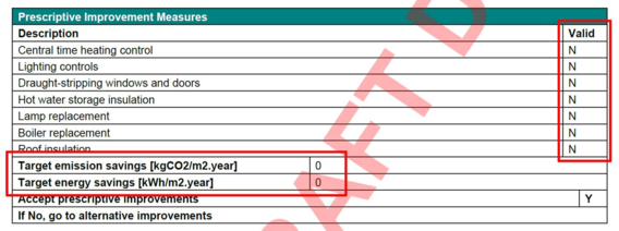 If none of the prescriptive improvement measures are applicable to the building (i.e. all seven measures are marked as N in the Valid column), there are no improvement targets for Section 63 -both Target emission savings and Target energy savings are zero, meaning no improvement is required. The party commissioning the report should be advised that no action beyond lodgement of the final Action Plan is needed to comply with the regulations.