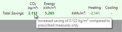 3. If the mouse cursor is hovered over a savings value, a tooltip will be displayed to indicate the increased or decreased saving relative to using the prescriptive measures in the original source project:
