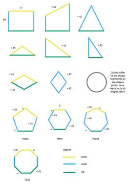 For orthogonal windows sill, jamb and lintel are easily defined. For multi-sided windows a convention (based on 45o from the x-y plane) is employed to determine sill, jamb and lintels.