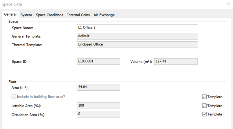 Space Data is set by default from the Space Thermal Template currently assigned to the space. Check boxes next to the data items (marked ‘Template’) enable you to override these settings.