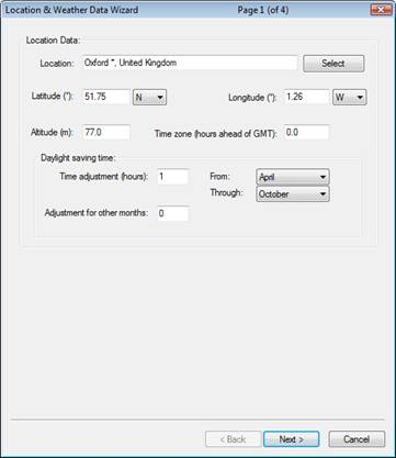 This dialog shows the following location data: Latitude, Longitude, Altitude, Time Zone and Daylight saving time data. These parameters are described in section 2 of this manual. The location and daylight saving time data are all editable. When any data other than Location name is edited, the Location name has an asterisk added to indicate it is no longer from the ASHRAE database. In any case the user can edit the Location name as they wish. To access the ASHRAE and CIBSE location database choose the select button: