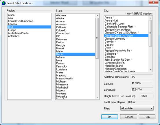 This shows the Select Site Location… dialog. The location of the model can be defined by navigating through Region, Country/State/Province and City in that order. Non-ASHRAE locations are marked with an asterisk (*). The latitude, longitude and altitude of the site will then be shown in the non-editable boxes. Note these values can be changed within the Location & Weather Data Wizard.