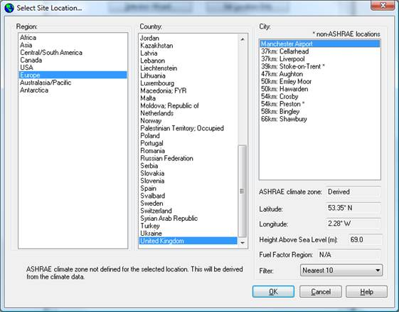 Two further items that only appear here, and are not editable by the user, are ASHRAE climate zone and Fuel Factor Region. Where the ASHRAE climate zone is not known, it will be automatically derived from climate data and the word Derived will be displayed here. Further information about ASHRAE climate zones, see the ASHRAE 90.1-2004 standard. The Fuel Factor Region determines the fuel carbon emission factors applying to the location. These are set as the default values in Fuels Data.
