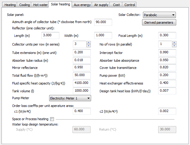 In the case of a collector used for space heating or process load (as opposed to DHW), two more parameters are required. Tick to activate these parameters. The collector cannot be used to feed two different process. If the PTC provides heat for the DHW system, eventual heat excess cannot feed other process (space heating or process load).
