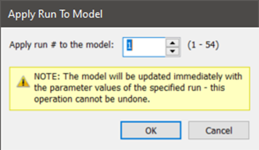 Once the parametric analysis is complete the user has the option to pick a parametric run by ID number and apply the parametric changes back to the current model. The Parametric Tool uses a find and replace mechanism for applying changes to the model. With exception of glazing, if the parameters do not exist in the model the “Applied run” parameters values are not applied.