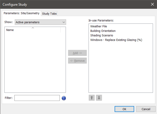 The dialog Study tabs tab allows the user to set what category tabs are active in the Parametric dialog.