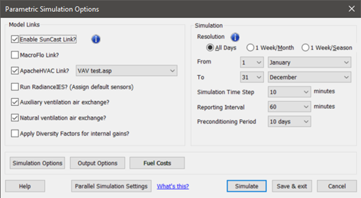 In the parametric simulation options dialog the resolution feature mentioned in section 3.4 allows the user to change the definition of the period to be made up of either the default contiguous days or to be made up of sub-periods (month or season) that are simulated (a week per sub-period).