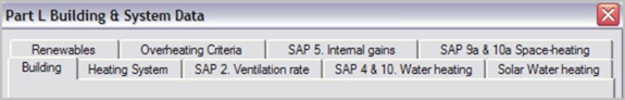 This pop-up dialogue, which may be accessed either via the Building Settings button ‘Set Building & System Data’ or via the Settings menu, allows you to enter general data relating to the building and its systems required for the SAP compliance calculation. The dialog has nine tabs that require input relevant to the SAP methodology. The tabs are shown below:
